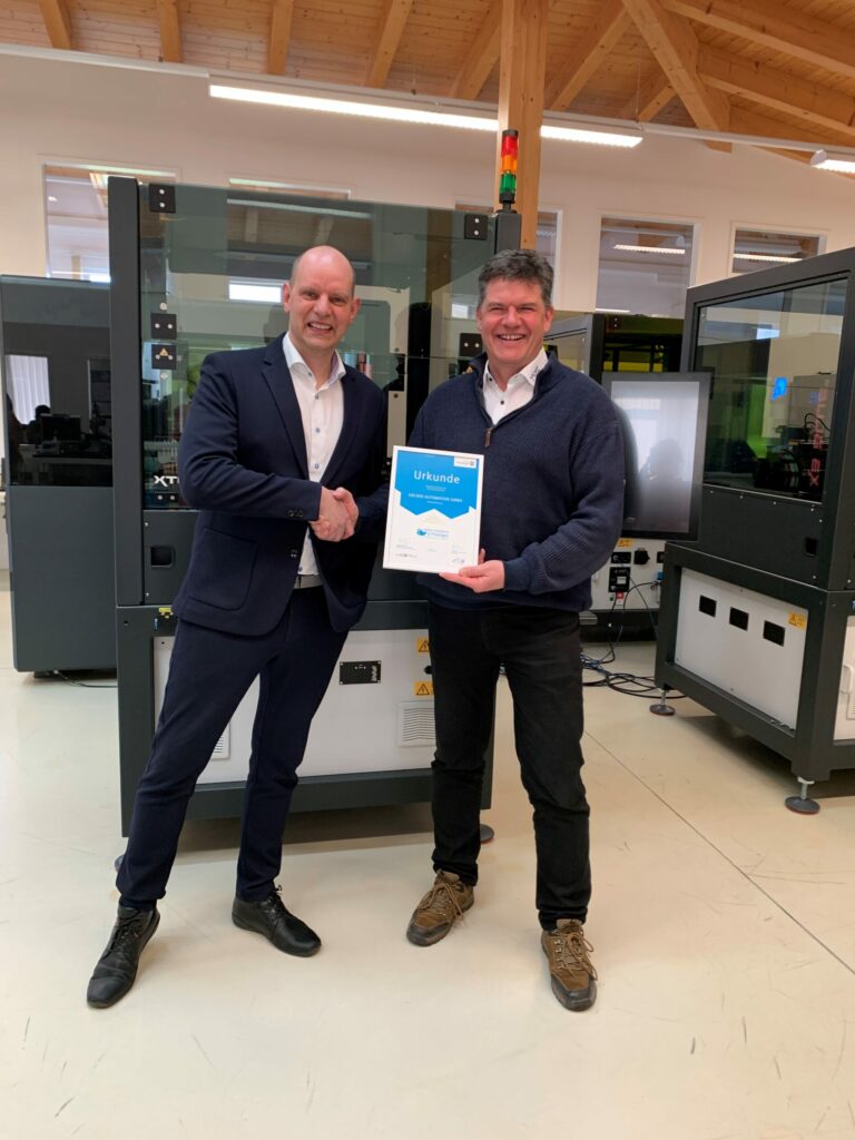 Geschäftsführer Gerrit Häcker empfing die Urkunde von Dr. Stefan Blechschmidt, von der Landesentwicklungsgesellschaft Thüringen, die diese Ehrung in Zusammenarbeit mit dem Thüringer Wirtschaftsministerium initiierte.